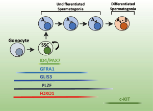 GLIS3 was recently identified as a key regulator of early stages of spermatogenesis and shown to have a critical function in SSCs (23). In mammalian testes, SSCs arise from non-mitotic gonocytes after they migrate to the basement membrane compartment of seminiferous tubules shortly after birth. Vitamin A and its derivatives, anti-Mullerian hormone (AMH) and FGF signaling are involved in the regulation of the gonocyte to SSC transition (48-50). The differentiation of gonocytes into SSCs is marked by the translocation of the transcription factor FOXO1 from the cytoplasm to the nucleus. FOXO1 remains expressed in undifferentiated spermatogonia, but is not present in C-KIT+ differentiated spermatogonia (51).