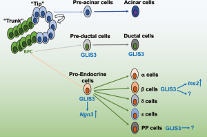 Development of the mouse pancreas begins with a dorsal and ventral outgrowth from the pancreatic progenitor cells in dorsal foregut endoderm [reviewed in (76-78)]. Both outgrowths follow a similar lineage commitment, with branching morphogenesis leading by E12.5 to distinct cell populations in the “tip” and “trunk” compartments. The tip region contains multipotential pancreatic cells (MPCs), defined by their co-expression of PDX-1, PTF1A, NKX6.1, SOX9, and HNF1β, which can generate all pancreatic cell types and control overall pancreas size (79). By E14.5, these cells largely switch to a pro-acinar program and subsequently differentiate to mature acinar cells. The trunk domain, in which PDX1+SOX9+HNF1β+NKX6.1+PTF1A− bipotent progenitor cells reside, will give rise to both preductal cells, which subsequently differentiate into mature pancreatic ductal cells, and pro-endocrine cells. The latter will give rise to all 5 different lineages of hormone-producing endocrine cells (Figure 3). GLIS3 expression is first observed at the protein level in this trunk domain, but is never observed in the PTF1A+ tip domain (45). Although little is known about the mechanism that induces GLIS3 expression, the transcription factors HNF1β has been implicated in the regulation of GLIS3 transcription (80). Subsequently, during a period known as the “secondary transition”, cells within this trunk domain will make a lineage fate decision between ductal cells and endocrine cells, a process that is not totally understood. Induction of neurogenin 3 (NGN3) is linked to the commitment of bipotent progenitors to the pro-endocrine lineage (76-78). Notch signaling is thought to play an important role in this decision (81,82), possibly through upregulation of HES1, which by repressing NGN3 expression promotes ductal cell differentiation (76,83-86). Unlike several transcription factors that are restricted to either the ductal cells (such as HES1) or endocrine cells (such as NGN3), GLIS3 remains expressed in both endocrine and ductal cells (45,84,87). The latter indicates that GLIS3 may not play a major role in the duct/proendocrine lineage fate decision.